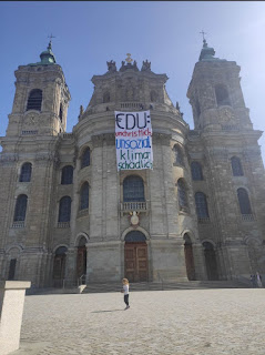 In der Nacht zum 25. September 2021 hängt es an der barocken Fassade der Basilika St. Martin in Weingarten. Ein 60 Quadratmeter großes Banner in 30 Metern Höhe, auf dem weithin sichtbar steht: "€DU unchristlich unsozial klimaschädlich". Und was passiert ein knappes Jahr später? Die Justiz will ein Exempel statuieren, die beiden Aktivist:innen, Charlie Kiehne (20) und Samuel Bosch (19), sind des Hausfriedensbruchs angeklagt, in kirchlichen Gremien dagegen finden sie Zuspruch.