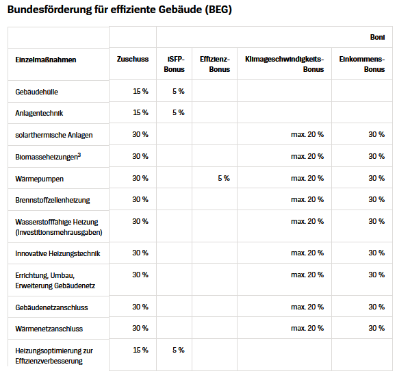 Dennoch wird die Grundförderung höher ausfallen als bislang. Vom 1. Januar 2024 an steigt sie für Heizungen mit erneuerbaren Energien von 25 auf 30 Prozent, auch der Fernwärmeanschluss wird künftig mit 30 Prozent gefördert (siehe Tabelle).
