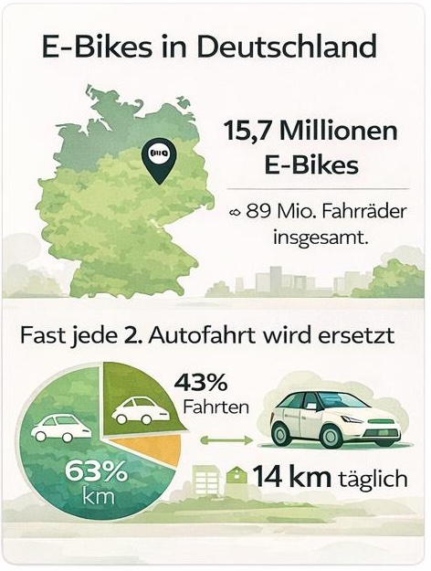 Autofahrten, greifen E-Bikes direkt in den Alltag ein: Sie verringern